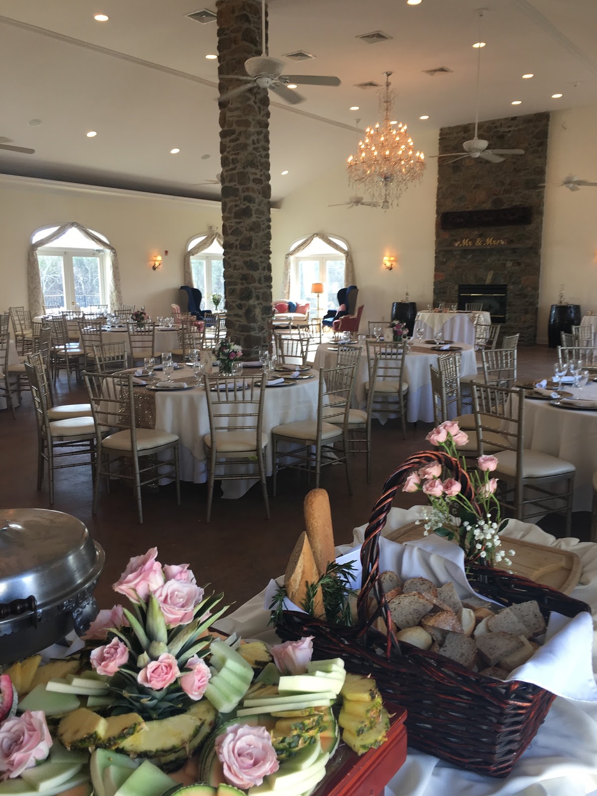 Teatime kicked things off on a Friday evening with a catered rehearsal dinner in one of the smaller rooms at the venue. We served a plated dinner with Cesar Salad as the first course followed by Fried Chicken (groom’s favorite!), Citrus Glazed Salmon, Miniature Baked Mac ‘N Cheese with Panko Topping, Fresh Fruit and Whole Green Beans.