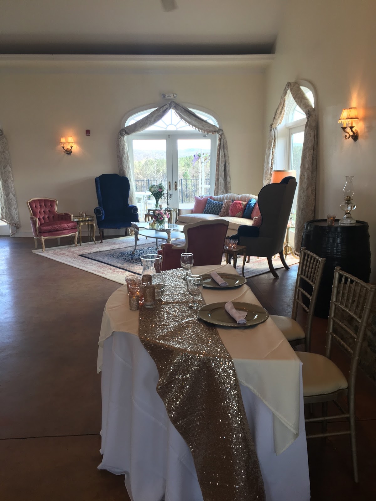 The wedding reception was the following day held inside the Fox Den dining room. A simply marvelous addition was an ensemble of rented vintage furniture set up in one corner of the dining room. It was unique and colorful, the guests enjoyed hanging out all evening, and it set this wedding reception apart with a whimsical touch.